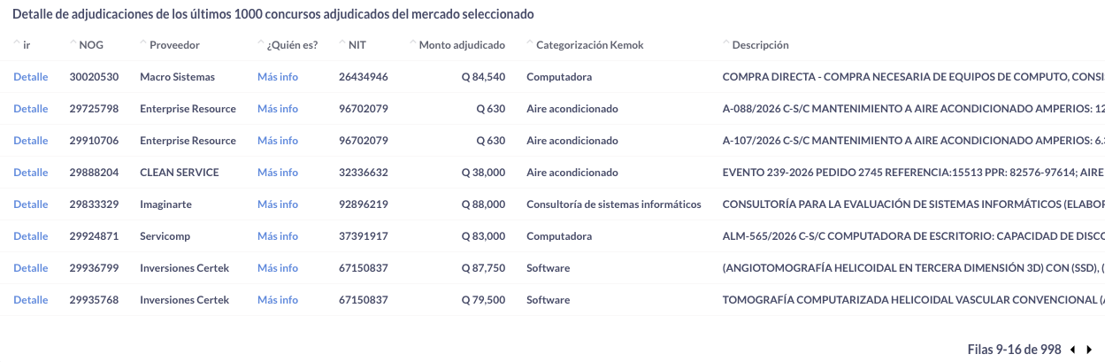 En la tabla "Detalle de adjudicaciones de los últimos 1000 concursos adjudicados del mercado seleccionado" puedes obtener un listado de los concursos en los que se solicitó al menos un producto de tu interés, pero no participaste.