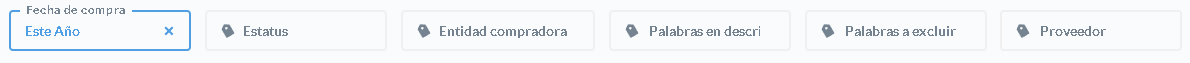 En el filtro "Fecha de compra", selecciona el período que deseas revisar. Puedes usar también los filtros de Entidad compradora, Proveedor y Palabras clave para afinar tu búsqueda.